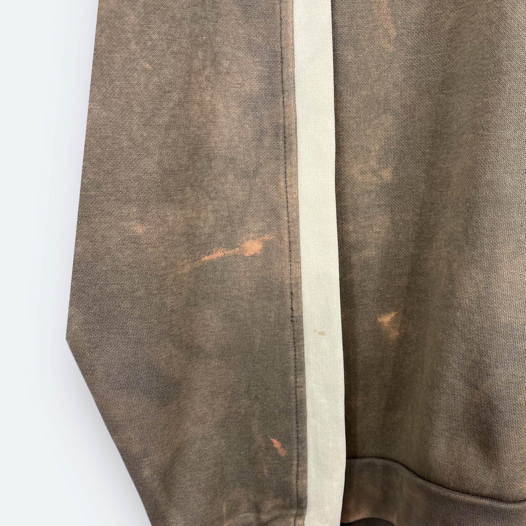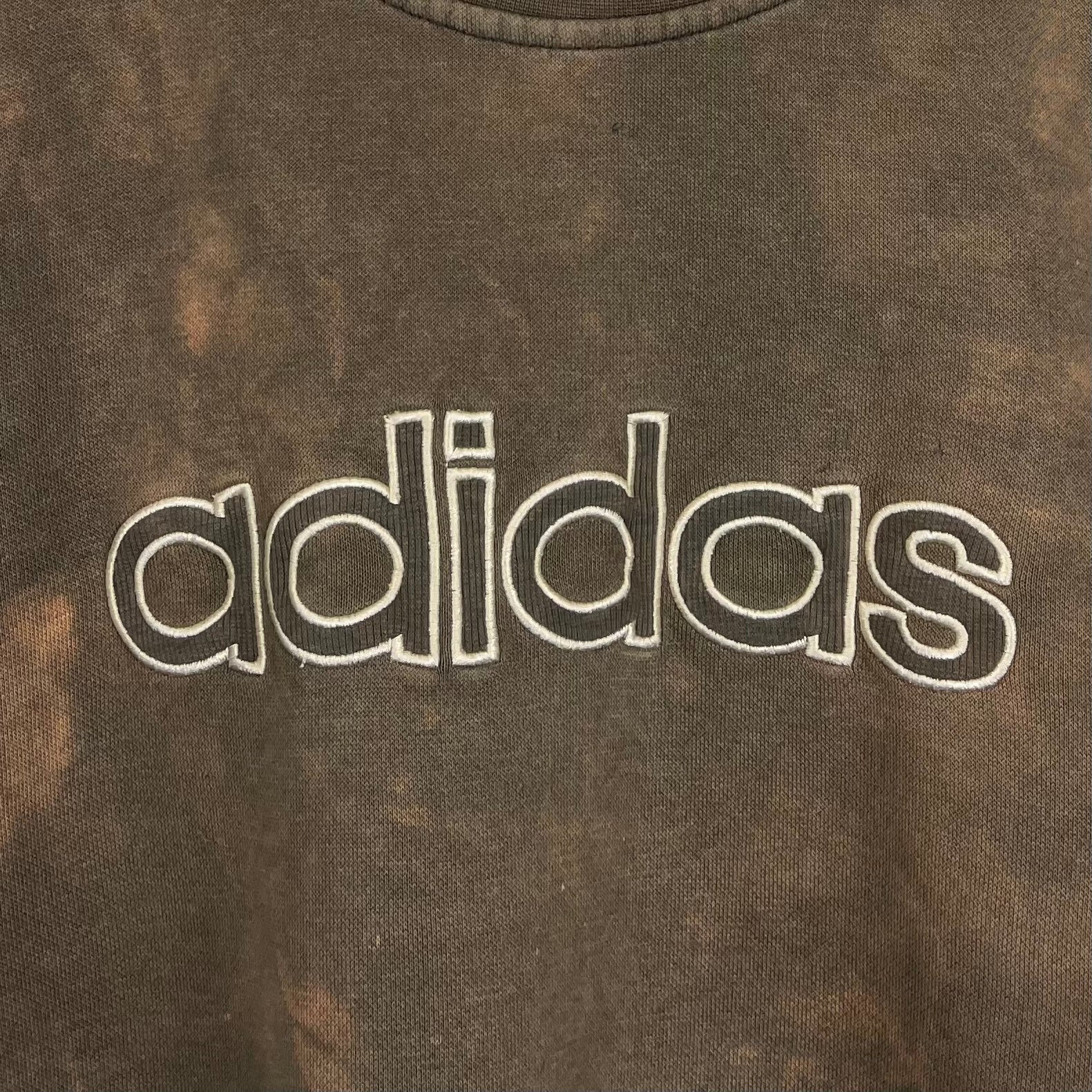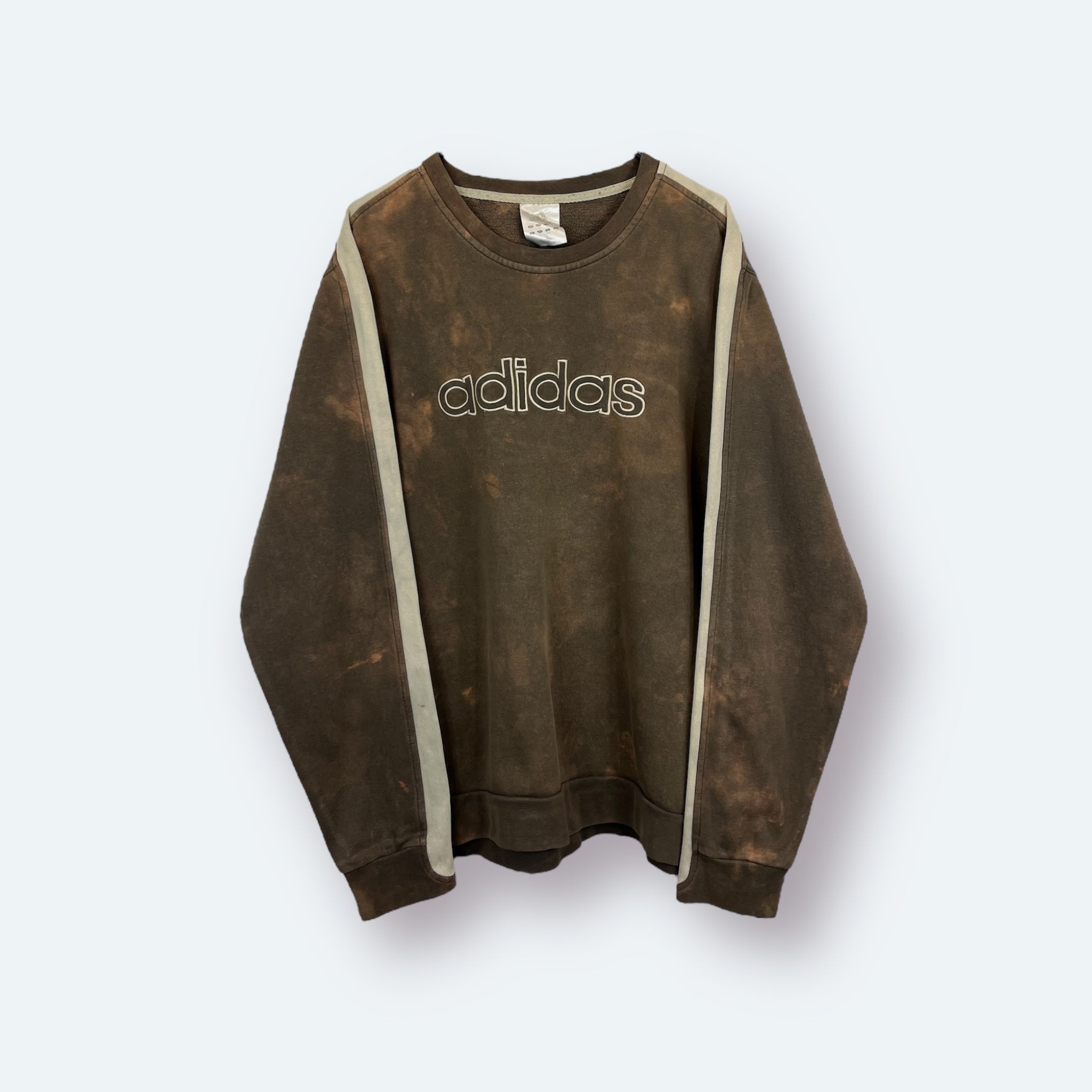 Dieser braune Adidas Vintage Sweater aus 2007 wurde per Hand gebleicht und ist somit ein echtes Unikat. Auf der Brust prangt ein großes, hochwertig gesticktes Adidas Logo – sportlich, bold & iconic.
