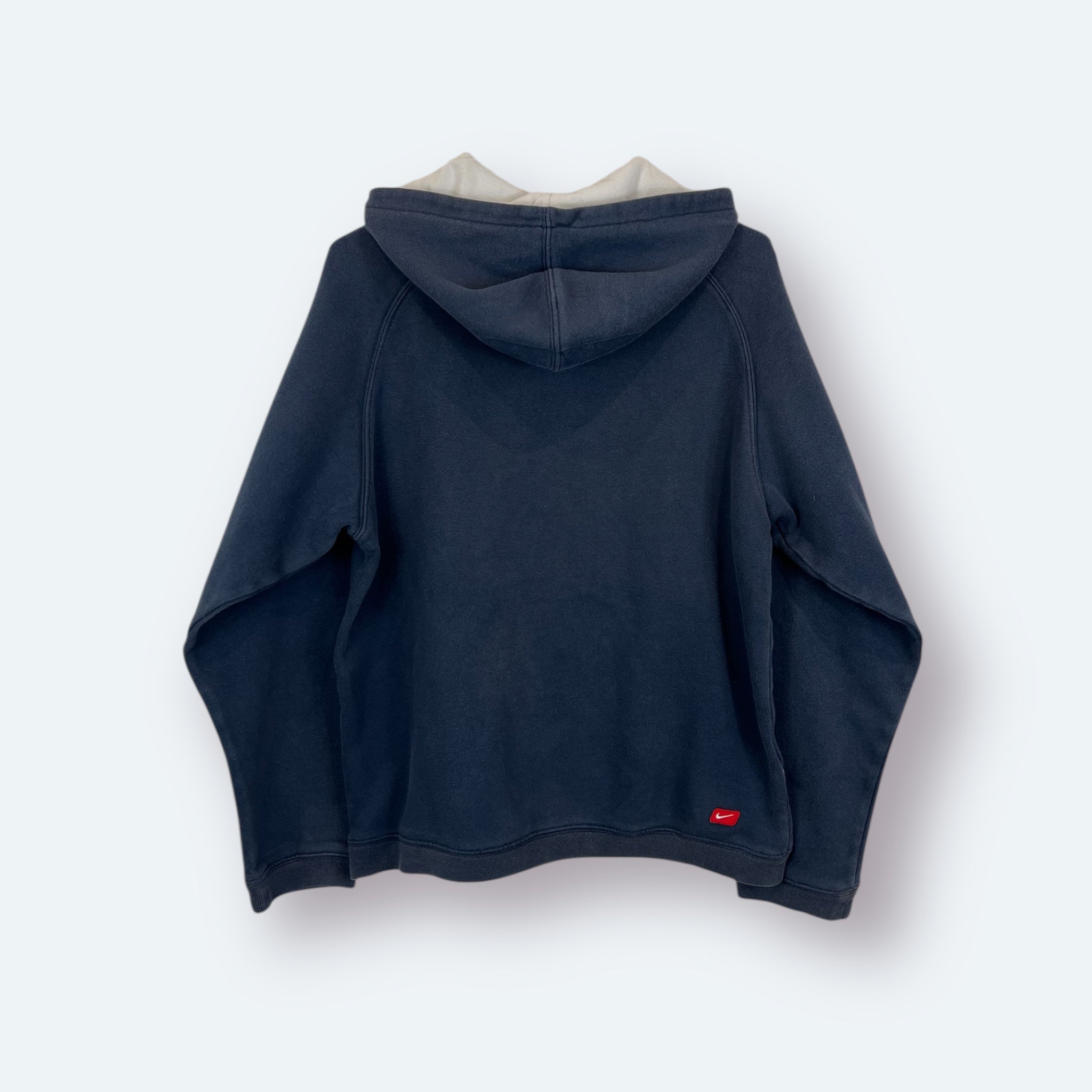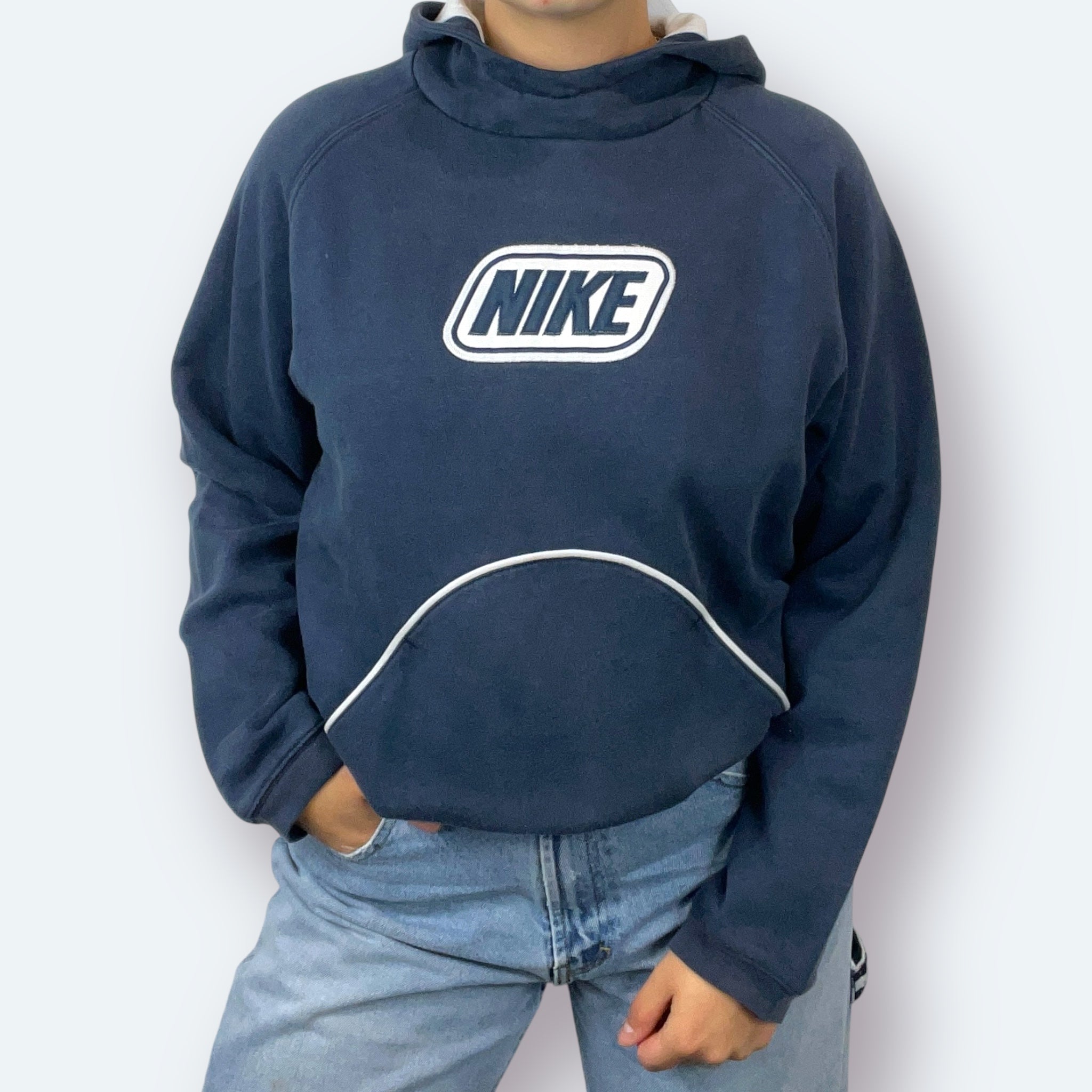 Dieser dunkelblaue Nike Vintage Hoodie stammt aus den frühen 2000er-Jahren und zeigt auf der Brust ein auffälliges, seltenes „Racing Badge“-Sticklogo, das in dieser Form nur vereinzelt in der Nike Sportswear-Linie auftauchte. Ein echtes Sammlerstück – schlicht im Schnitt, aber mit besonderem Detail.